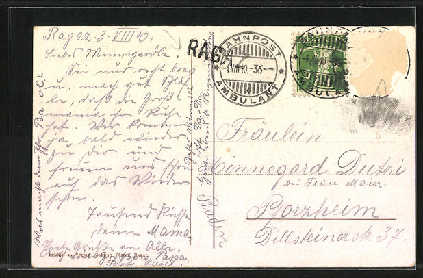 gelaufen 1910, Briefmarke teilweise entfernt, Stempelspur, Bugspur rechts oben, sonst guter Zustand