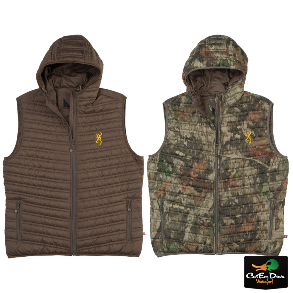 | Lightweight warmth. Designed to be part of your clothing arsenal all year long, the Packable Puffer Hooded Vest sets its sights on both warmth and compressibility. The combination of a tough polyester micro-ripstop fabric and PrimaLoft® Silver blended down insulation make for a vest that is highly compactible. In warmer conditions, the Packable Puffer Vest stows away virtually unnoticed in your pack until called upon to take away after-dark chill or an unplanned breeze in the high country. In cold weather it becomes a great mid layer. You can buy with confidence as we are an Authorized Browning dealer. Feel free to contact us with any questions you may have. ![]() |