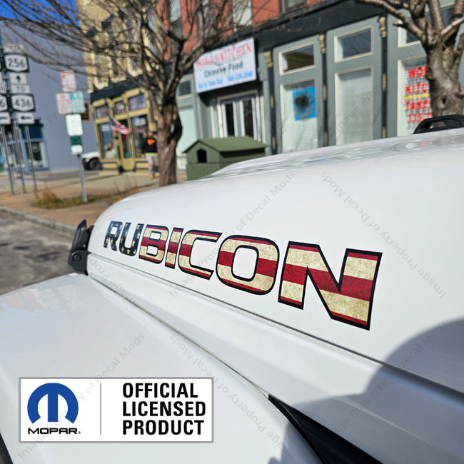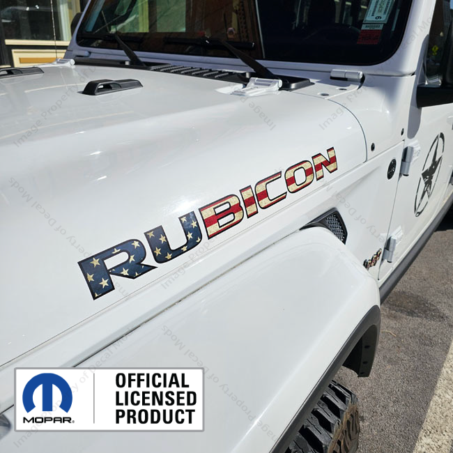 This set includes the following: - Set of 2 - Distressed American Flag RUBICON hood decals - Decals are in the style: Flag with black outline (part number: FJ5S9) - Installation Instructions |