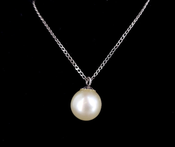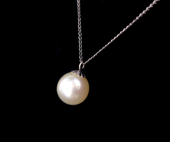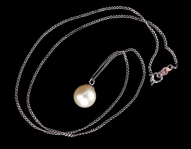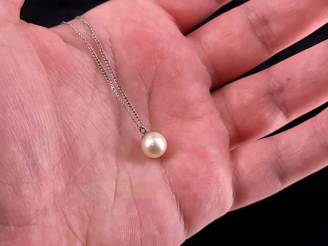 The item up for offer is a lovely Maui Divers pearl necklace. This necklace consists of a large white South Sea White cultured pearl. Pendant is unmarked but the chain is marked “14k”.