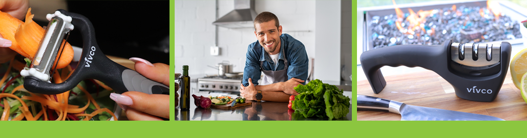 Perfect peels every time! The Vivco peeler is multifuctional with a choice of 3 blades - Standard Peeler, Julienne Peeler & Fine- Serrated Peeler.