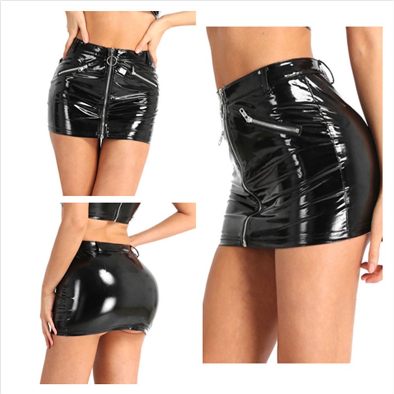 Women Open Butt Lace-up Miniskirt Wet Look Patent Leather Skirt.