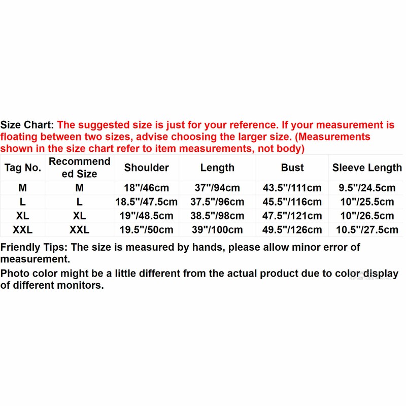 | Tag No. | Recommended Size | Shoulder | Length | Bust | Sleeve Length |