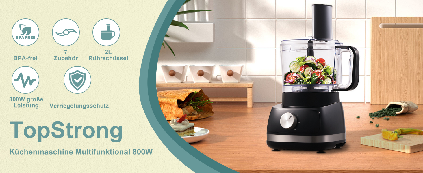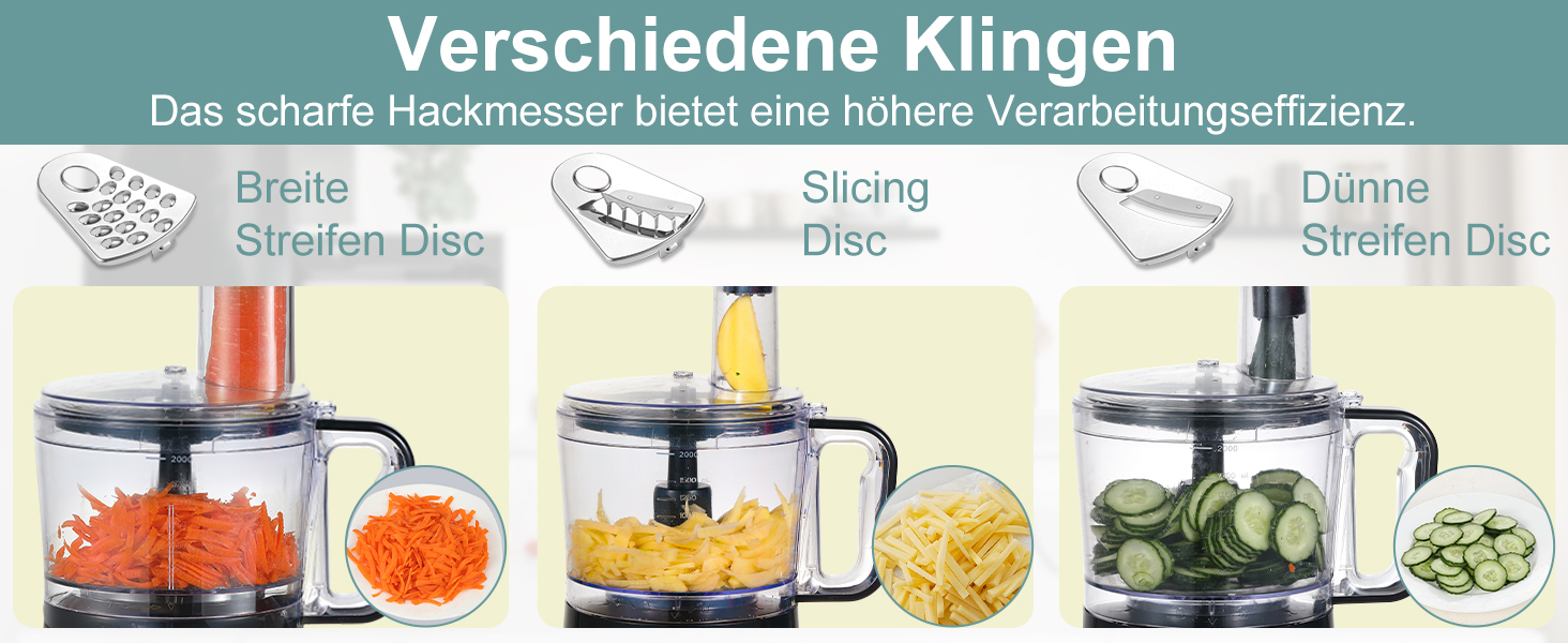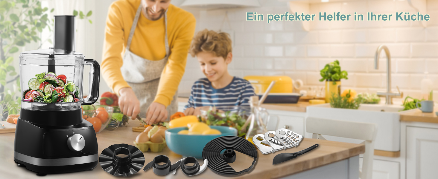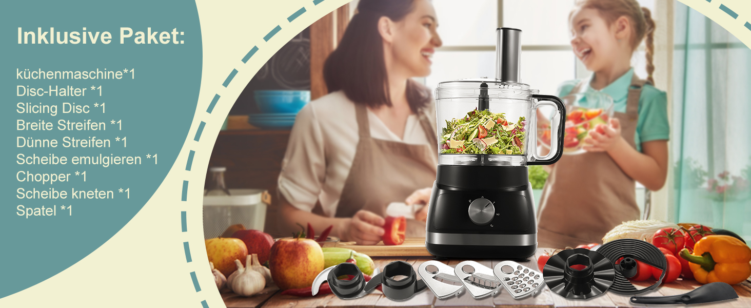 Die multifunktionale küchenmaschine wird mit verschiedenem Zubehör geliefert und damit kann man hacken, fein oder ausgiebig schneiden, mischen, entsaften, Schleifen, verquirlen und kneten. Sie können damit frische und gesunde Säfte, leckere Salate, Kuchen und Kekse und andere Köstlichkeiten zubereiten.
