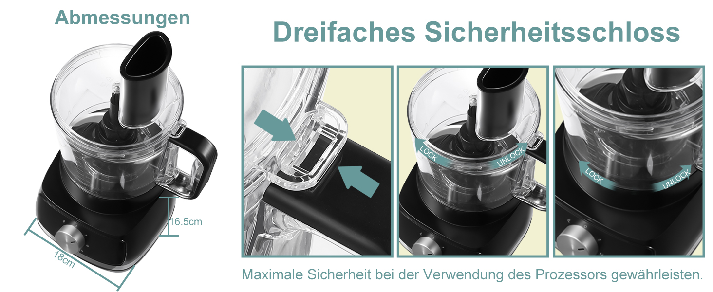 Dual-Lock-DesignSNDOAS Küchenmaschine mit Sicherheitsverschluss deckel und rutschfesten Füßen für sicheren Betrieb.Sowohl am Schüsseldeckel als auch am Boden befinden sich Sicherheitsverschlüsse. Wenn Sie während der Arbeit Futter hinzufügen möchten, fügen Sie dies über den großen Einfüllschacht hinzu. |