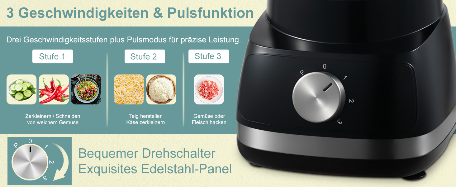 Die Küchenmaschine Zerkleinerer ist auch mit 3 verschiedenen Geschwindigkeitsmodi ausgestattet, Sie haben mehr Möglichkeiten bei der Verarbeitung von Zutaten und mit der Pulsfunktion haben Sie die volle Kontrolle über das Mischen und Zerkleinern. Die Steuerung erfolgt über einen Drehknopf und ist einfach und leicht zu bedienen.