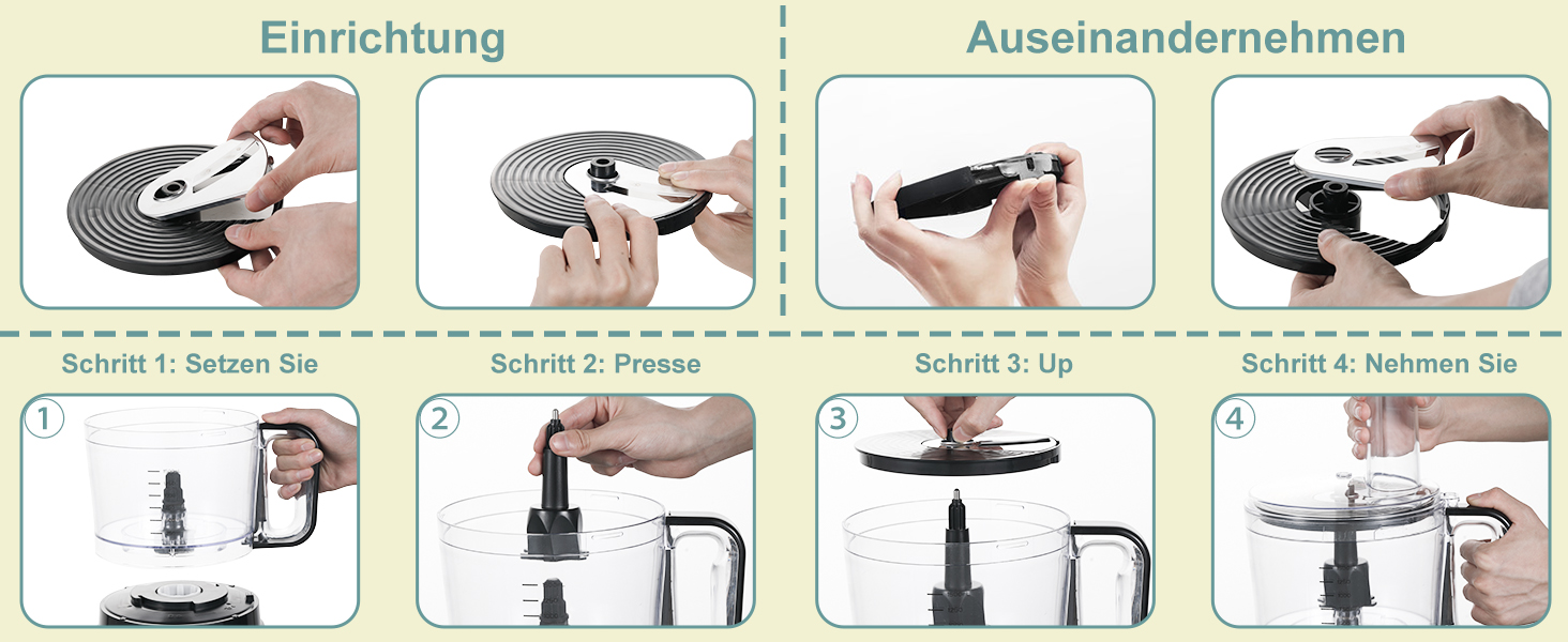 Mit 11-in-1 Küchenmaschine kann man hacken, fein oder ausgiebig schneiden, mischen, entsaften, Schleifen, verquirlen und kneten. Diese food processor und Mixer erfüllt Ihre Anforderungen an Kochvorbereitung.