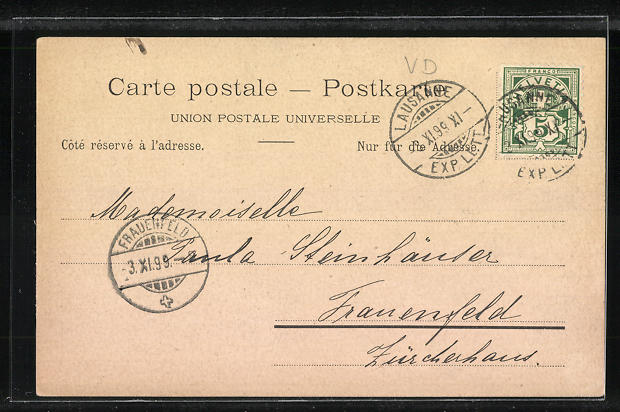 circulée en 1899, trace de cachet, pli au coin l. u., sinon bon état
