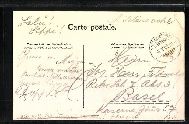 circulée en 1908 als Militärsache, plis aux coins gauche, sinon bon état