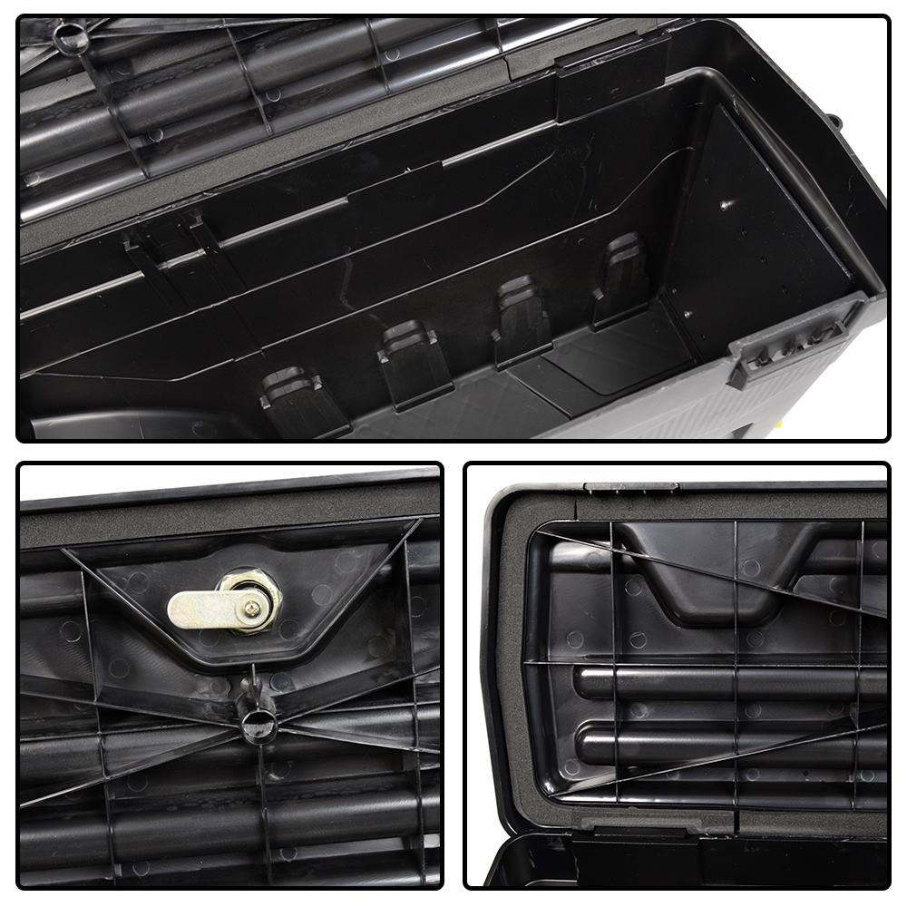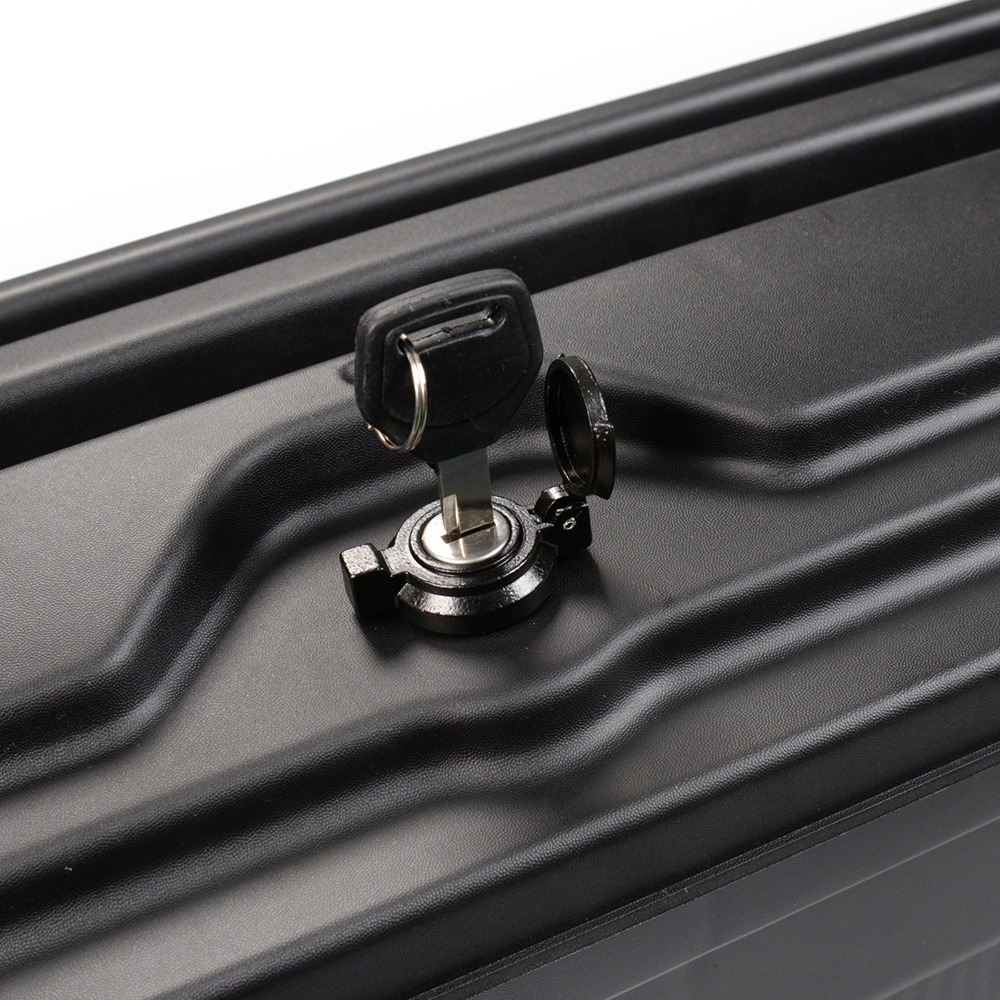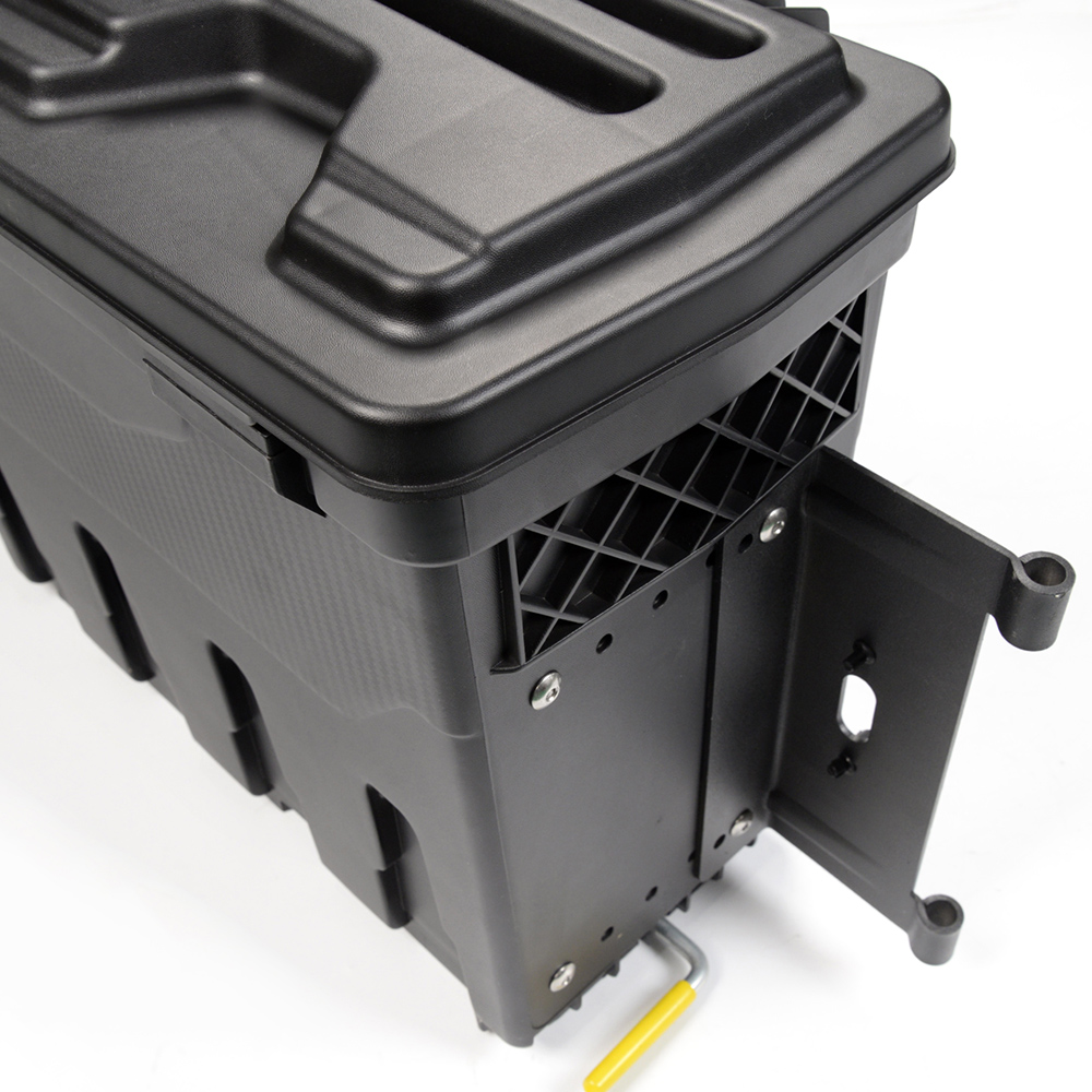 Heavy Duty ABS Plastic Construction Removable Tray Sealed Lid to Keep Moisture Out Lid with Built in Lock & Key Box is Easily Removable off the Hinges for Transport Matte Black Finish Mounting Hardware with Eyelet to Secure Box to Bed Box Swivels out for Easy Access 75LB Capacity