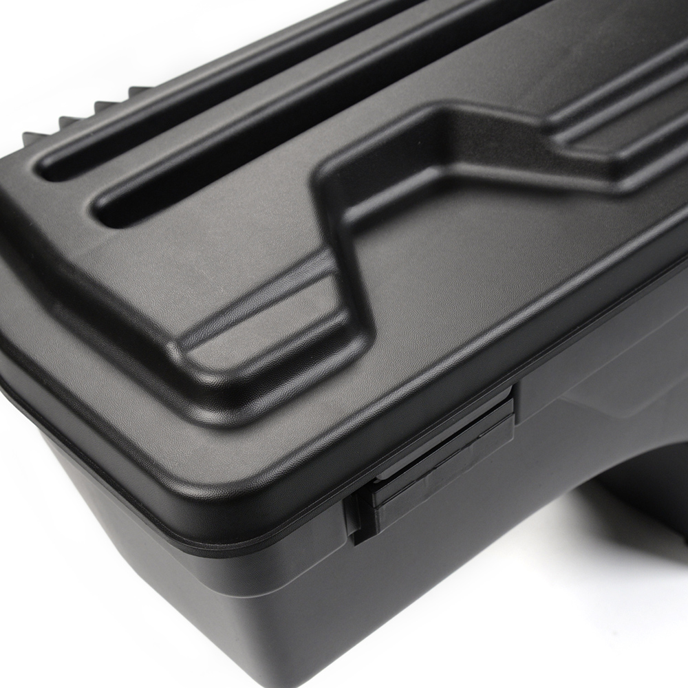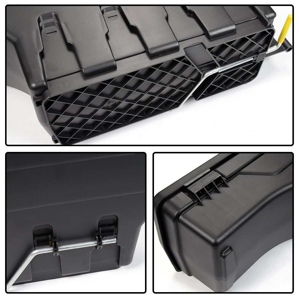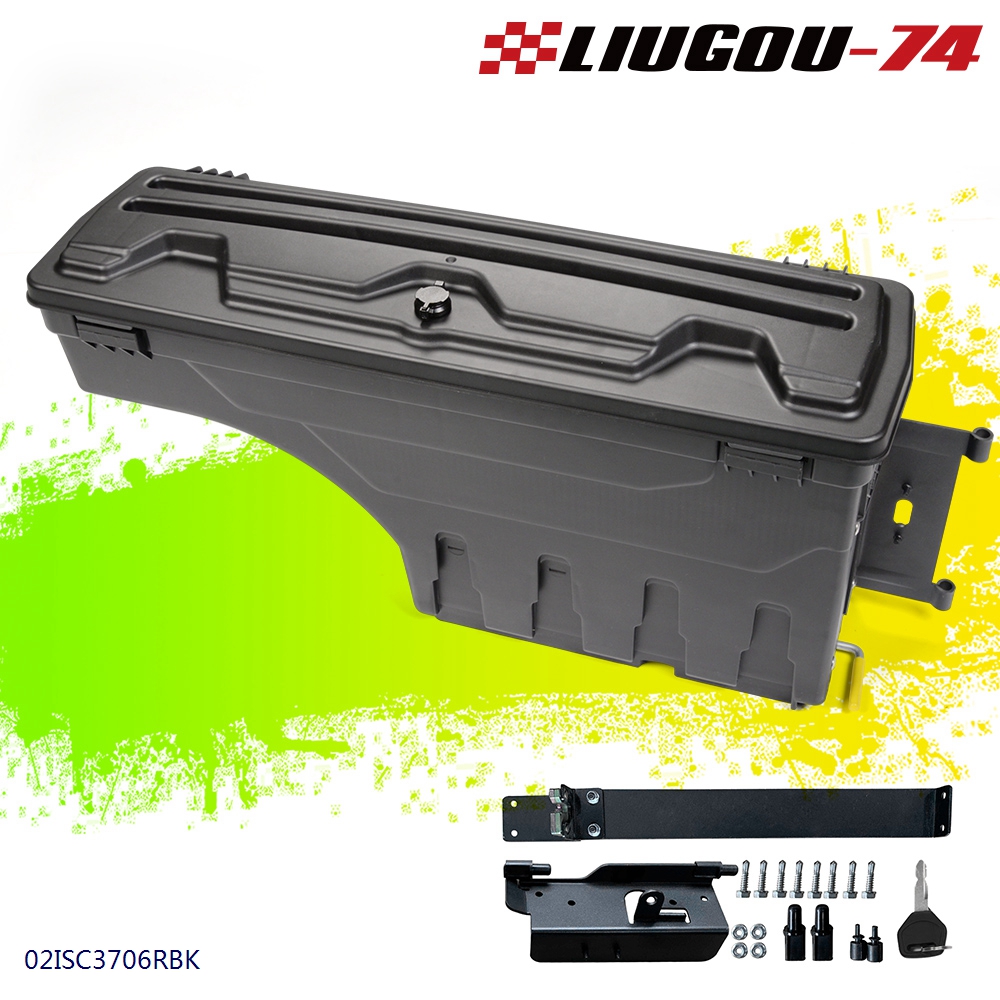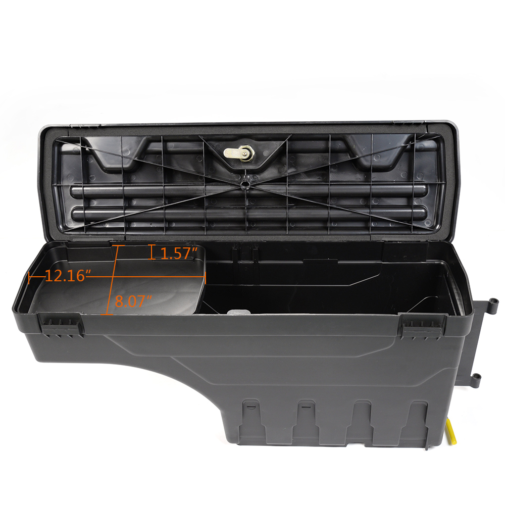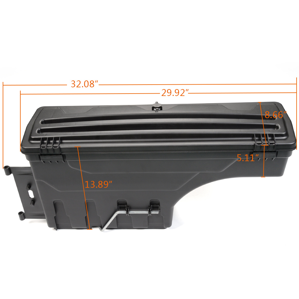 Secure, transport, and access your belongings in your truck bed easily. This wheel well box is made out of heavy duty abs plastic and is locked and weather sealed. The mount has a eyelet to install a lock to secure to the bed and the box can swivel out for easy access with the pull of the bottom handle.
