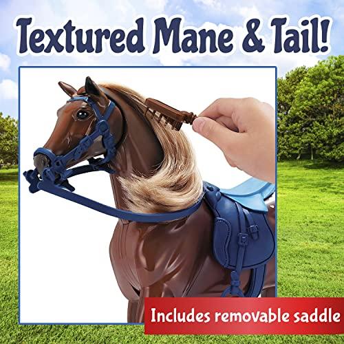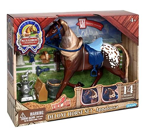 Saddle up for hours of great fun and happy trails with the Blue Ribbon Champions Deluxe Appaloosa Horse. Horse lovers of all kind will admire the movable head, brushable mane and tail, and the life-like sounds that come with this toy. The removable saddle, feeding accessories, and toy brushes add to the adventures of caring for this horse toy. Mix with other toys and stable sets or use it on its own. Junior equestrians will love to prance and gallop with this this fun toy horse, then move the head to hear realistic sounds. Realistic detailing and strong construction make it a favorite for horse enthusiasts of all ages!