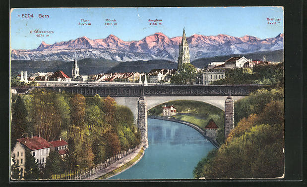 AK Bern, Brücke und Bergpanorama mit Eiger, Mönch und Jungfrau