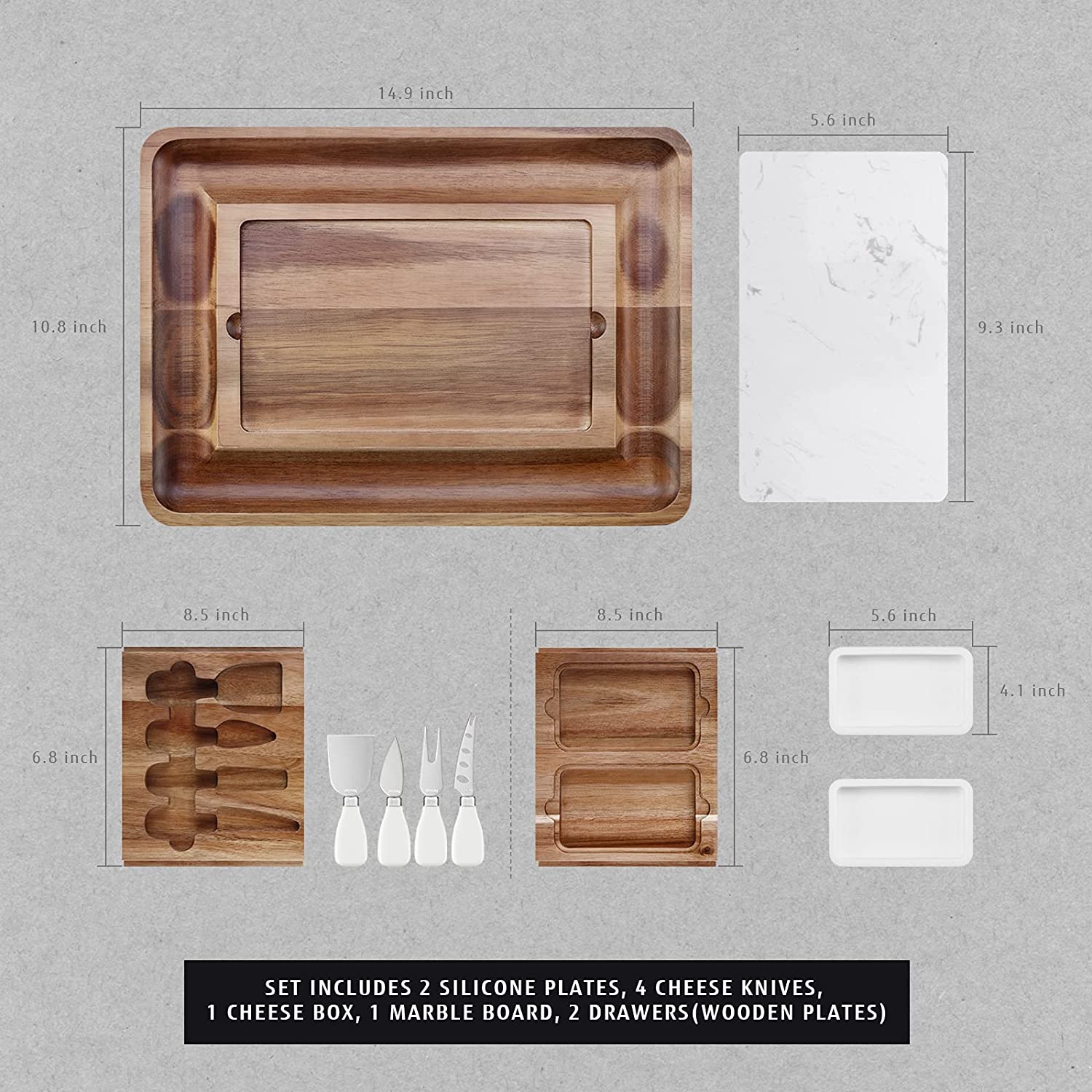 Showcase Your Charcuterie board 100% hochwertiges Akazienholz Akazienholz hat ausgezeichnete Eigenschaften, die seit der Antike bekannt sind. Es ist ein edles, sehr festes Holz, das gegen Termiten resistent ist. Die rot-gold-orange Farbe verleiht Akazienholz Eleganz und Vielseitigkeit. Perfekt zum Servieren. Es ist auch ein sauberes und porenfreies Material, das keine Gerüche oder Flecken aufnimmt. Es ist aufgrund seiner Haltbarkeit und schönen Ästhetik ein Grundnahrungsmittel bei der Herstellung von Premium-Küchenutensilien.
