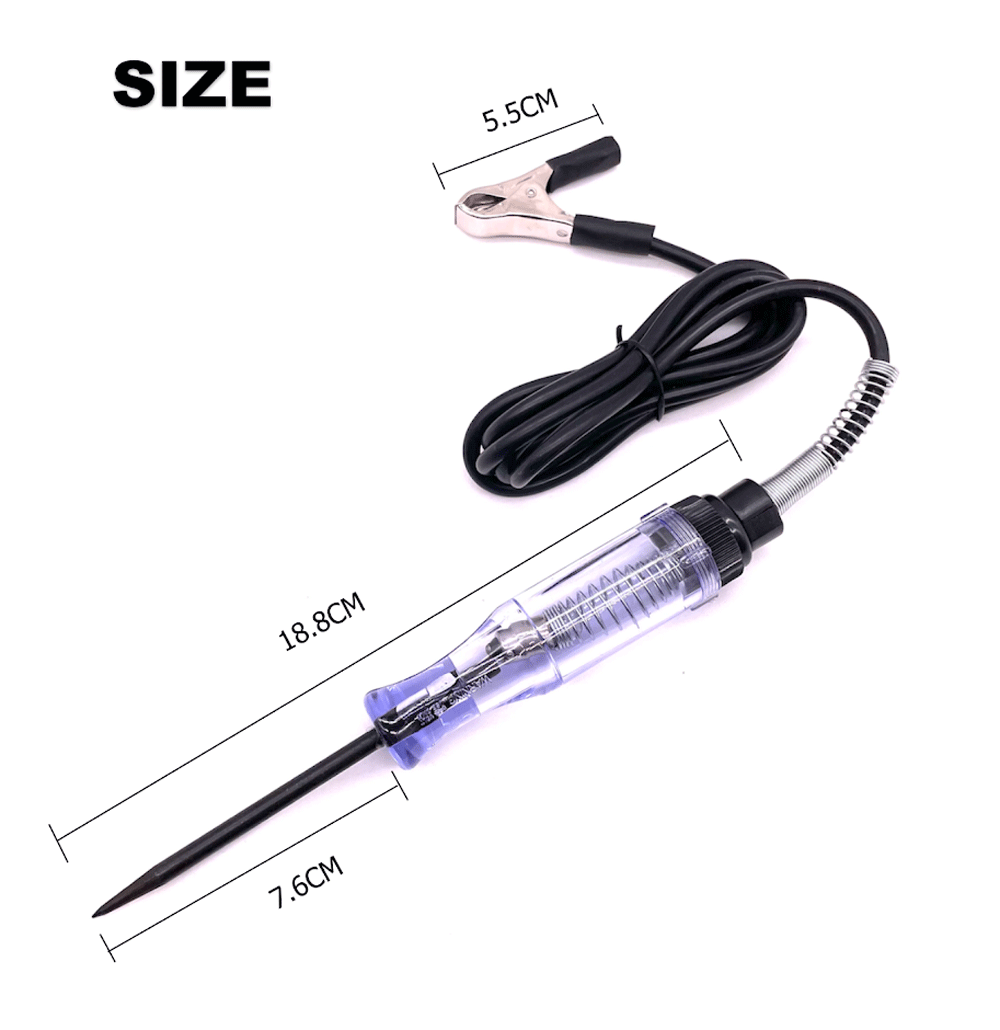 Product Description: 1. Circuit Tester for 6V / 12V DC Systems Long Probe Continuity Tester. 2. It can be used to detect power, ground and find shorts and breaks in wires. 3. Just unscrew the test pencil top metal cap to replace the light tube and time-saving. 4. Handle Brightly Illuminates if Circuit is Good. 5. Quickly check automotive headlights, taillights, turn signal circuits, faulty sockets, connections, fuses, broken wires and more. 6. It will save you time and speed up the job, ideal for automotive use. 7. Portable-small size, compact structure, equipped with rack, convenient to carry and use.