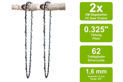 - 2 in 0.325 Zoll Teilung mit je 62 Treibgliedern