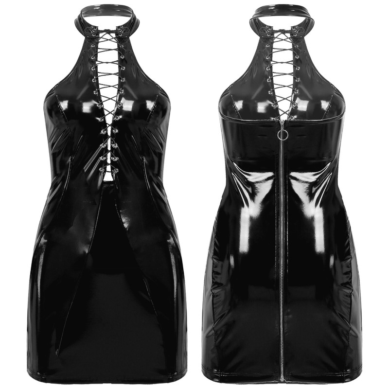 Womens Patent Leather Halter Dress Hollow Out Lace-up Backless Dresses.