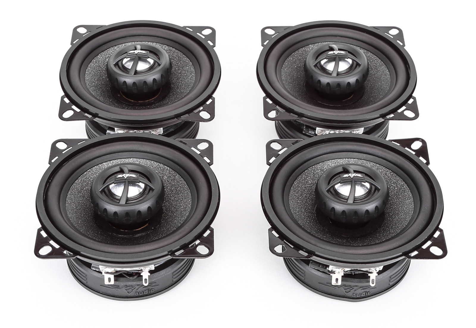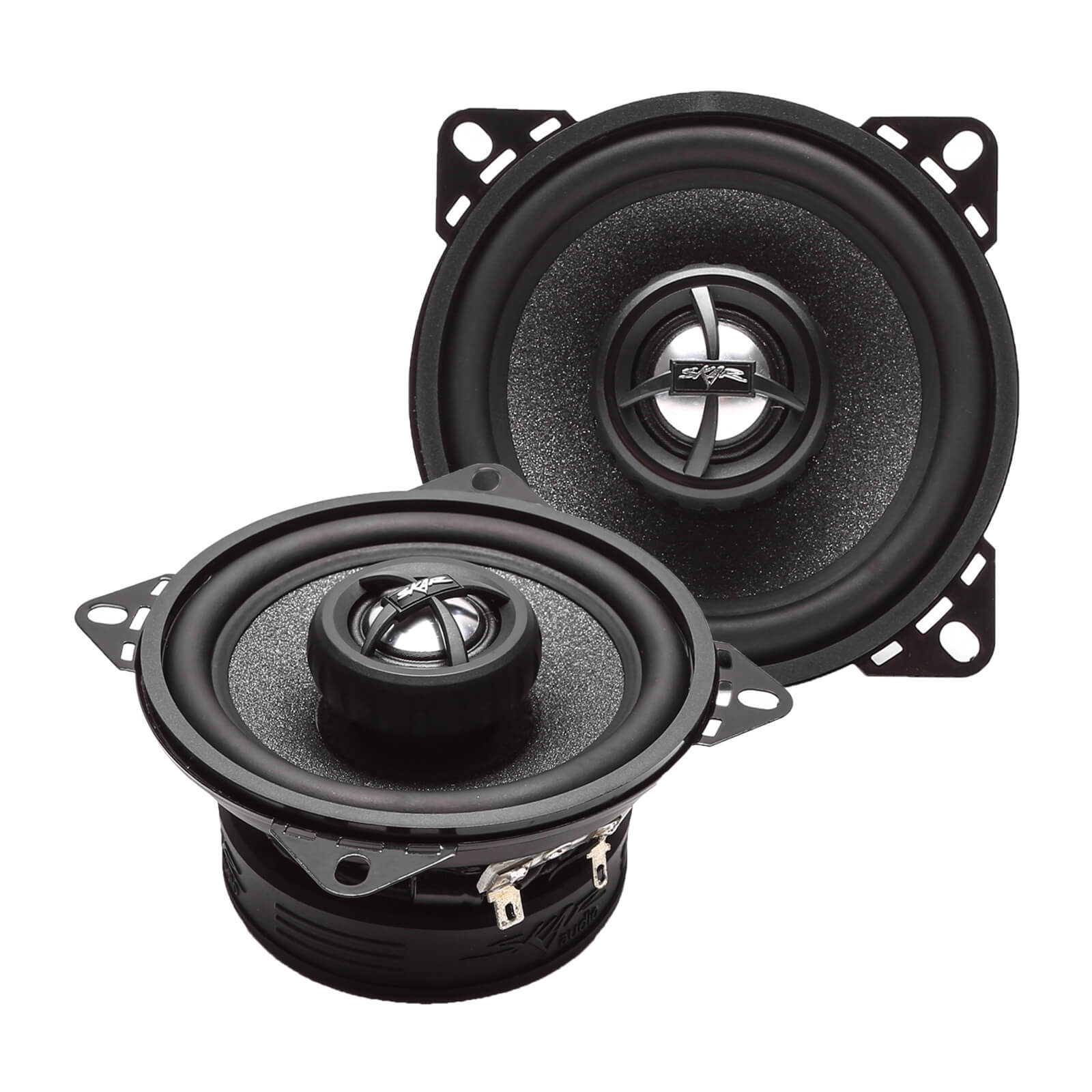 This is a package deal that includes (2) Skar Audio RPX4 Speakers.The RPX4 - 4-inch 2-way coaxial car speakers are great factory replacement speakers, providing rich, clear, and powerful sound. They work great on factory radio power or amplified power, and feature high quality build materials such as a microfiber paper cone and premium butyl rubber surround. All of these aspects of the speakers design allow it to offer great sound and long lasting reliability. The speakers feature a 20mm premium silk dome tweeter. Frequency Response: 50-20,000 Hz. Sensitivity: 89 dB. Sold as a pair. Impedance: 4 Ohms. Max Power: 120 Watts (Pair), RMS Power: 30 Watts (Pair).Sold as a Pair