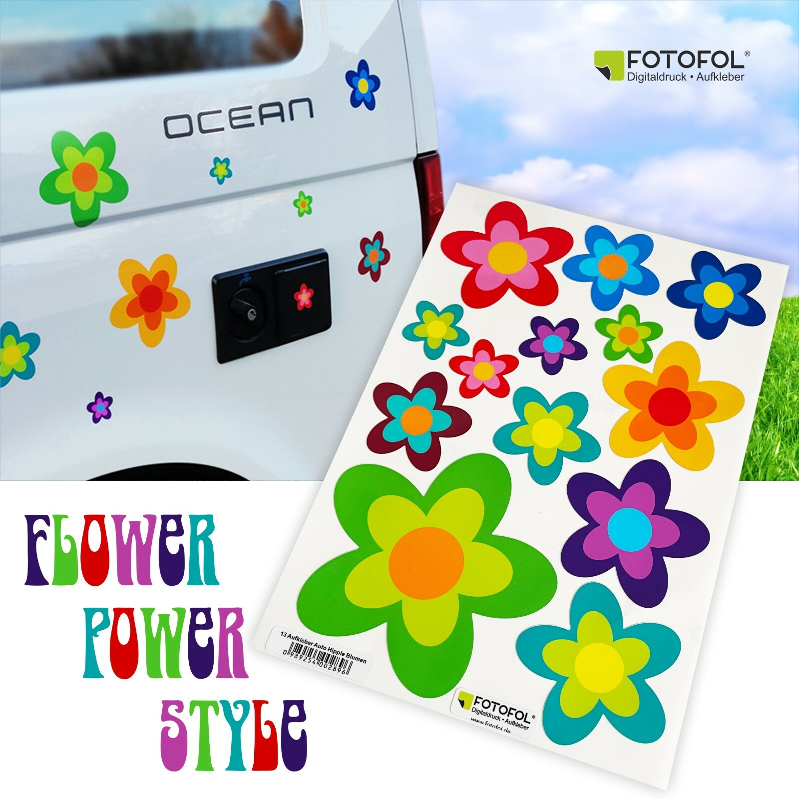 - 23 Aufkleber Auto Hippie Blumen Set bestehend aus 23 konturgeschnittene Aufkleber in Größen: 2x ca. 17cm, 4x ca.13cm, 5x ca.8cm, 4x ca.6cm, 8x ca.4cm .