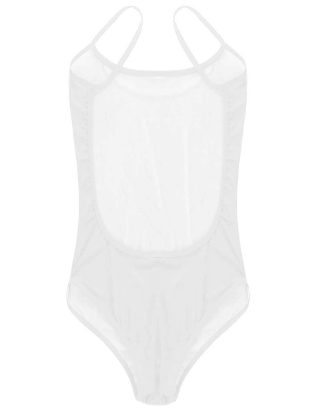 See-through sheer mesh design with spaghetti shoulder straps, deep u neck and backless, solid color, pull on closure.