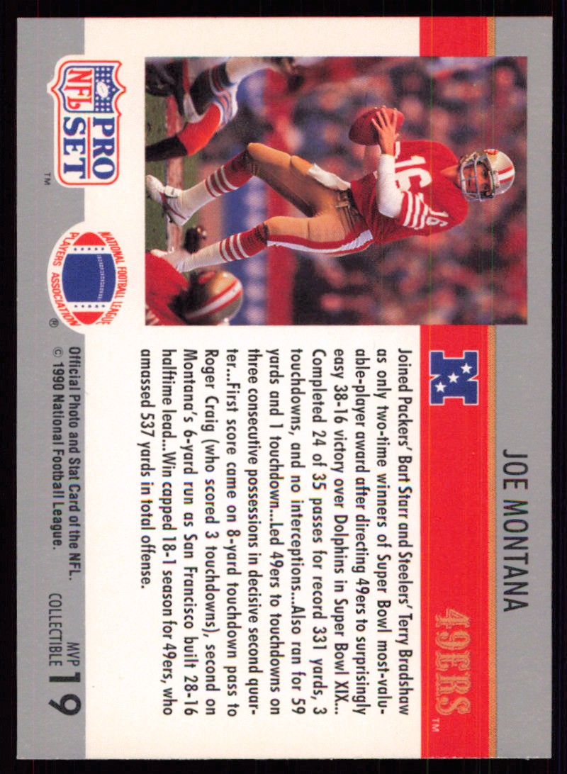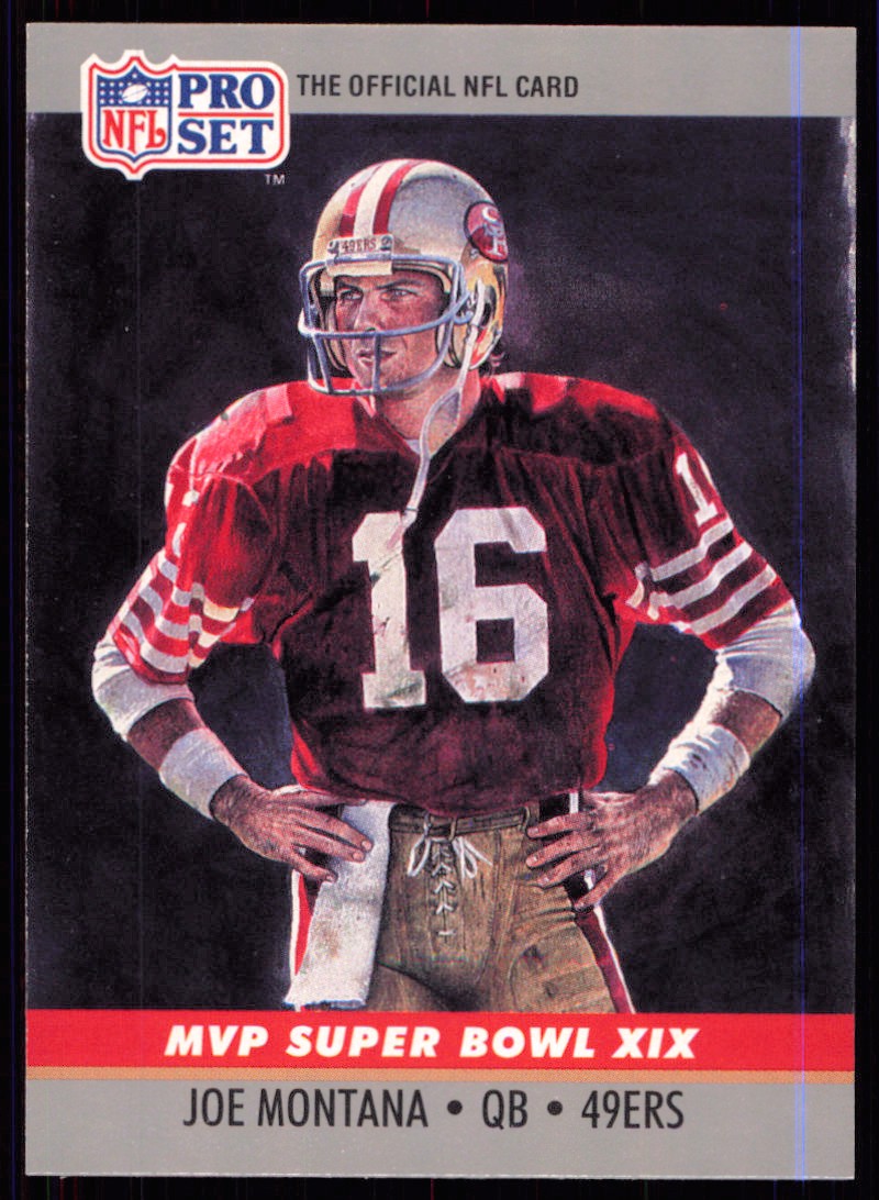 | Description: | Joe Montana | | Category: | Football | | Year: | 1990 | | Product: | Pro Set | | Team: | San Francisco 49ers | | Card Number: | 19 | | Dimensions: | 3½" x 2½" |