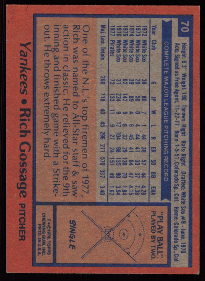 | Description: | Rich Gossage | | Category: | Baseball | | Year: | 1978 | | Product: | Topps | | Team: | New York Yankees | | Card Number: | 70 | | Dimensions: | 3½" x 2½" |