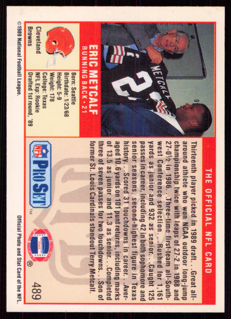 | Description: | Eric Metcalf | | Category: | Football | | Year: | 1989 | | Product: | Pro Set | | Team: | Cleveland Browns | | Card Number: | 489 | | Rookie: | Yes | | Dimensions: | 3½" x 2½" |