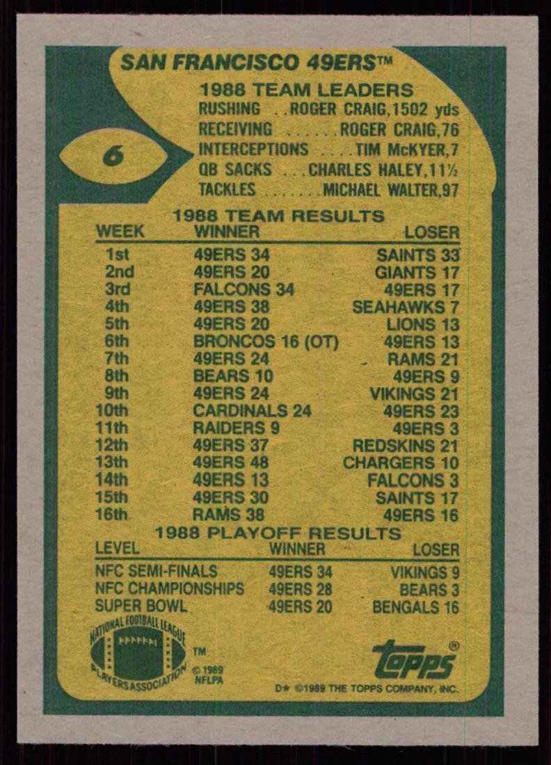 | Description: | Joe Montana on the Run | | Category: | Football | | Year: | 1989 | | Product: | Topps | | Team: | San Francisco 49ers | | Card Number: | 6 | | Dimensions: | 3½" x 2½" |