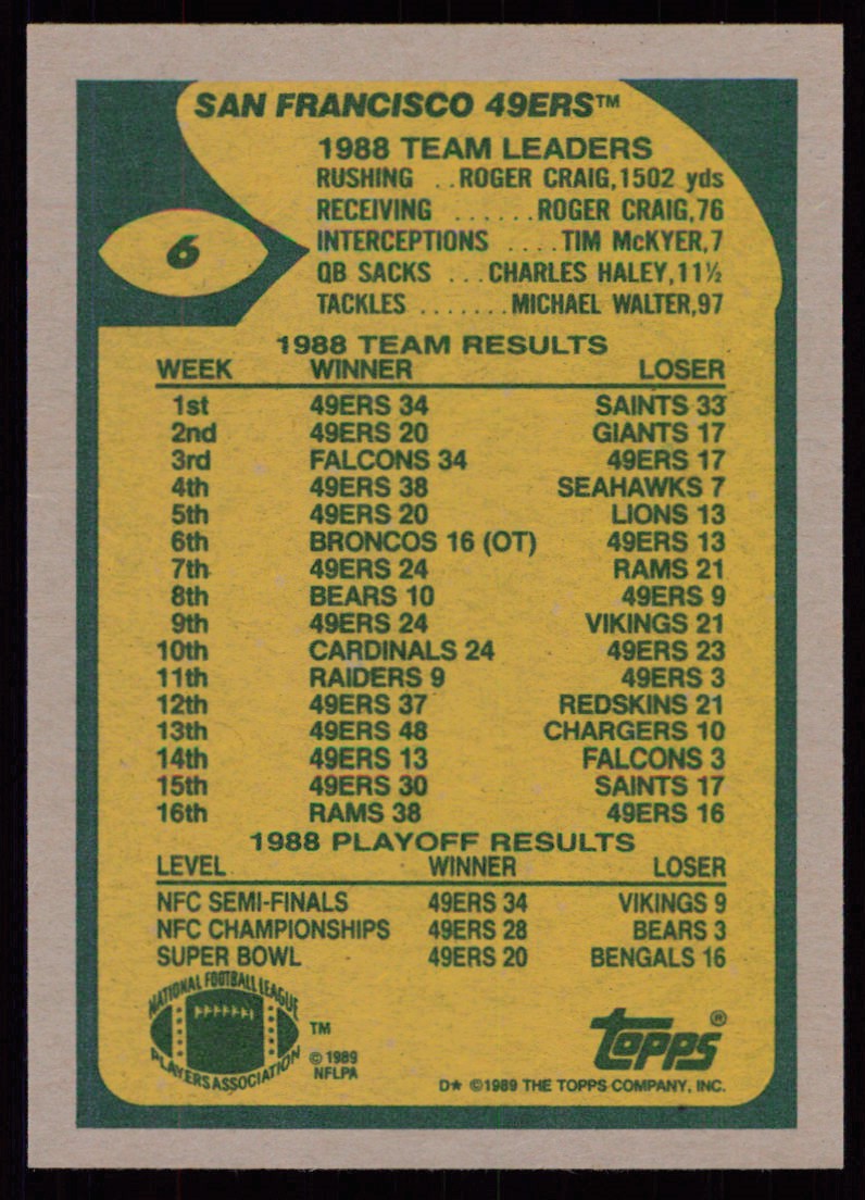 | Description: | Joe Montana on the Run | | Category: | Football | | Year: | 1989 | | Product: | Topps | | Team: | San Francisco 49ers | | Card Number: | 6 | | Dimensions: | 3½" x 2½" |