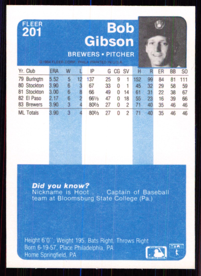 | Description: | Bob Gibson | | Category: | Baseball | | Year: | 1984 | | Product: | Fleer | | Team: | Milwaukee Brewers | | Card Number: | 201 | | Rookie: | Yes | | Dimensions: | 3½" x 2½" |