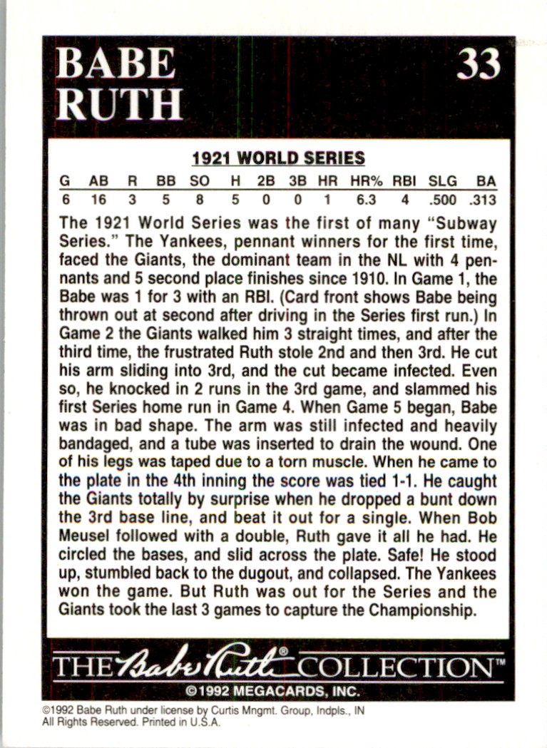 | 1992 Megacards Babe Ruth 33 Yankees Play in Their First World Series |