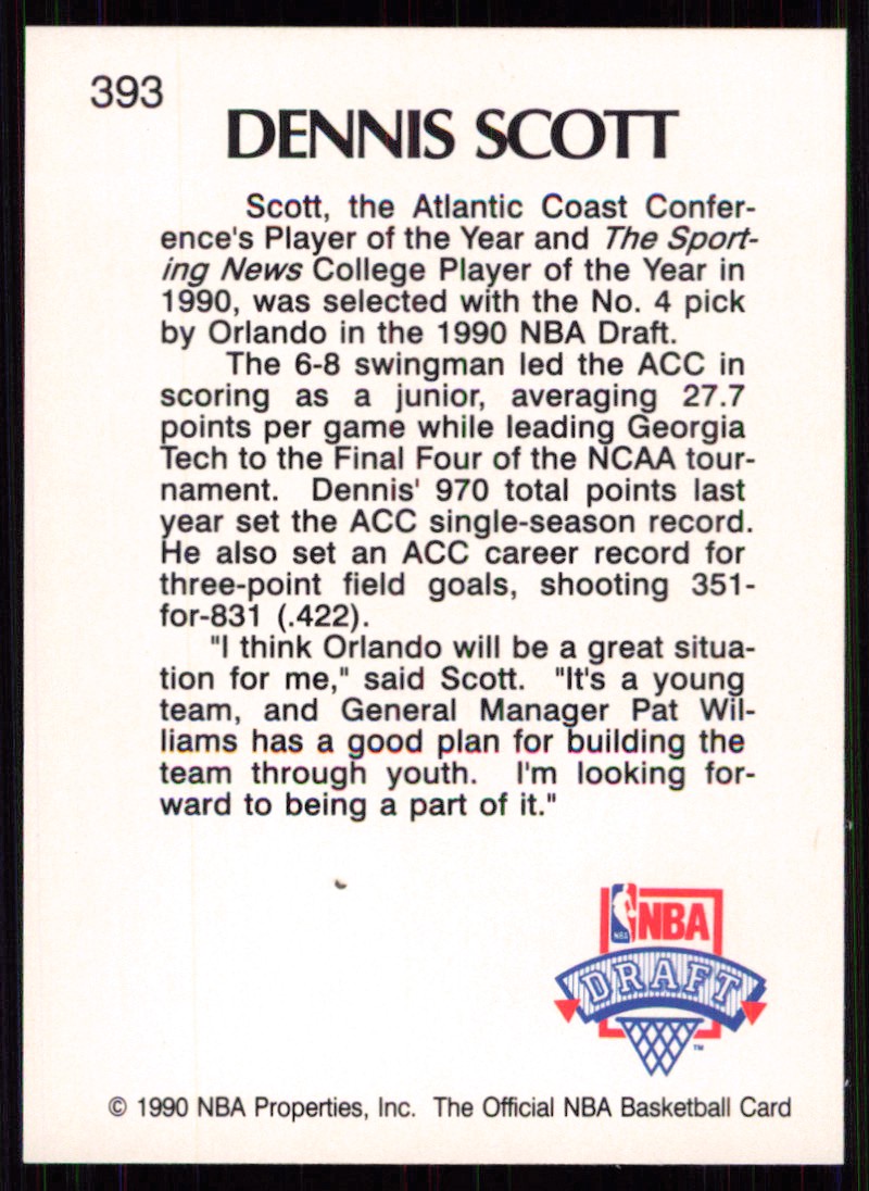 | Description: | Dennis Scott | | Category: | Basketball | | Year: | 1990 | | Product: | Hoops | | Team: | Orlando Magic | | Card Number: | 393 | | Rookie: | Yes | | Dimensions: | 3½" x 2½" |
