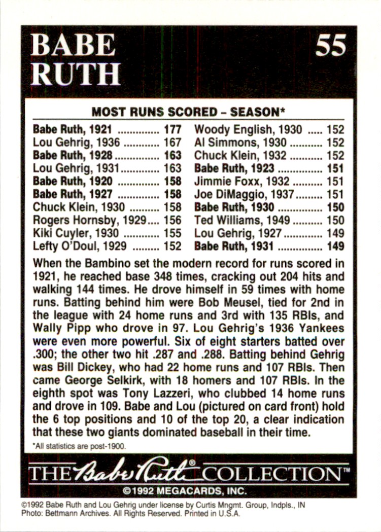 | Description: | Babe Ruth | | Category: | Baseball | | Year: | 1992 | | Product: | Megacards Babe Ruth | | Team: | New York Yankees | | Card Number: | 55 | | Dimensions: | 3½" x 2½" |