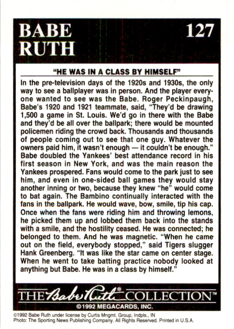 | Description: | Babe Ruth | | Category: | Baseball | | Year: | 1992 | | Product: | Megacards Babe Ruth | | Team: | New York Yankees | | Card Number: | 127 | | Dimensions: | 3½" x 2½" |