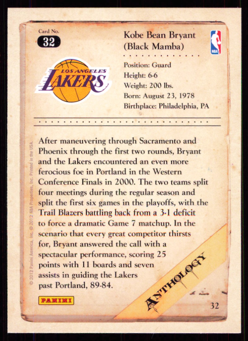 | Description: | Kobe Bryant | | Category: | Basketball | | Year: | 2012 | | Product: | Panini Kobe Anthology | | Team: | Los Angeles Lakers | | Card Number: | 32 | | Dimensions: | 3½" x 2½" |