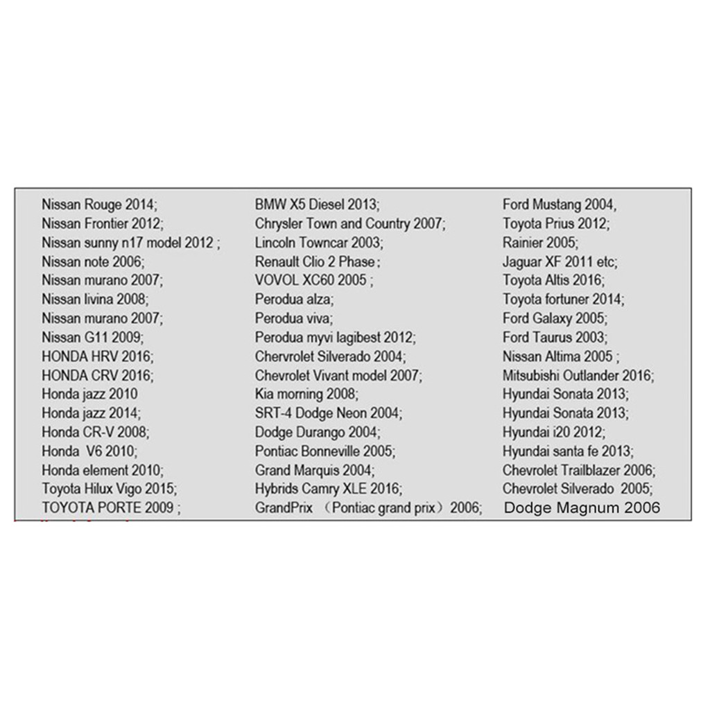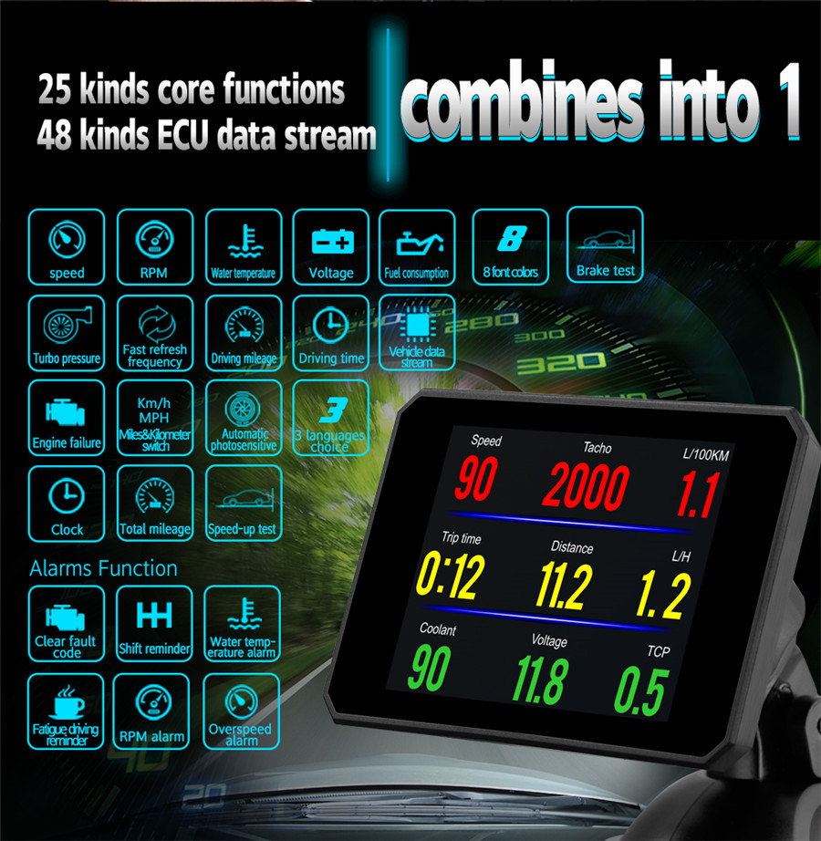 | Display Information | Speed,Engine RPM,Water Temperature, Voltage, Fuel Consumption, Total Mileage, Trip Mileage,Trip Time,KM/H or MPH,Turbo Pressure, Oil Temperature,Clean the fault code |