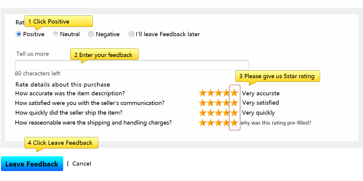 FeedbackAs we are honest seller,we live on feedback ,so your positive feedback and 5-star DSRs means a lot to us.We would very much appreciate it if you would leave us a 5-star positive feedback.
