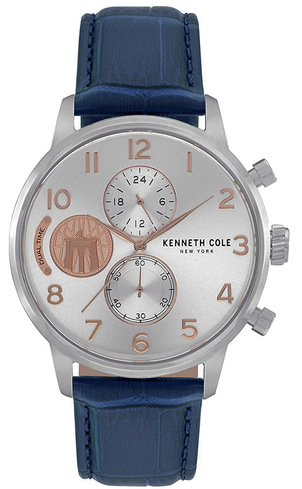 - Silver-Tone Steel Case. Blue Leather Strap.