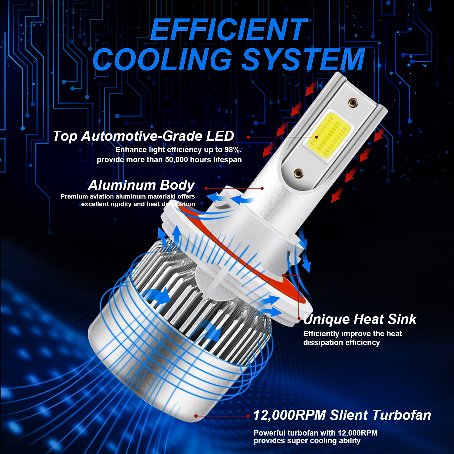 5.All-in one heat conduction+high speed mute fan system keep the light bulb in appropriate working temperature