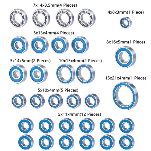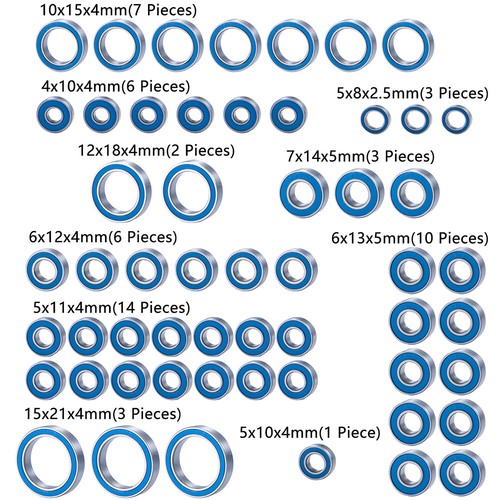 22PC For Team Associated B6.2--8911 This kit fits the following vehicles: For Team Associated B6.2 Includes 22 of the following sizes: (8) 3x7x3 (4) 10x15x4 (8) 5x10x4 (2) 5x12x4 | 27PC For Axial RR10 Bomber This kit is compatible with the following Axial vehicle: AX90048 RR10 Bomber 4wd Rock racer brushed RTR Ax90053 RR10 Bomber 4wd kit You will receive 27 of the following sizes of premium grade bearings: (21) 5x11x4 (6) 10x15x4 |