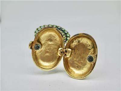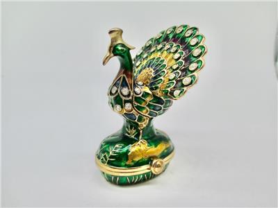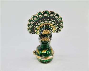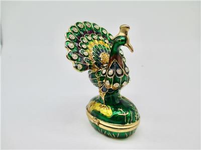 A stunning peacock jewelry box with bright vibrant colors! Treat yourself or someone special to a unique and fun jewelry and trinket box crafted from enamel and crystals. Use to store small items or they are beautiful to display as they are. Opens on a hinge and has a magnetic closure to keep the box shut securely. It measures 3 inches in height X 2 inches wide X 1 3/4 inches deep. Total weight 134 grams.
