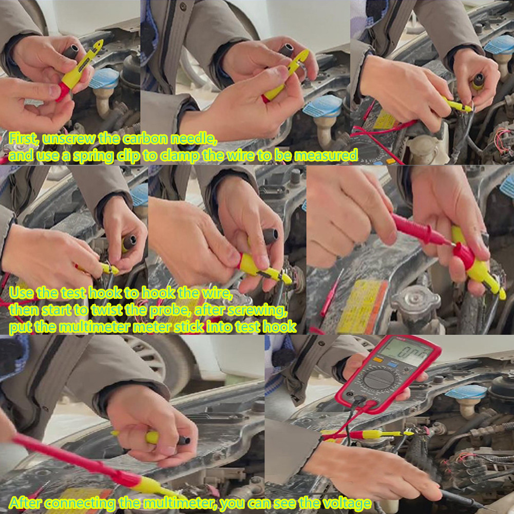 5.Use: attach it to the banana plug and then the other end can be hooked onto the insulated wire, by turning the red or black end of the clip the sharp needle pierces the insulation to make contact with the conductor.(Damage is fairly minimal).
