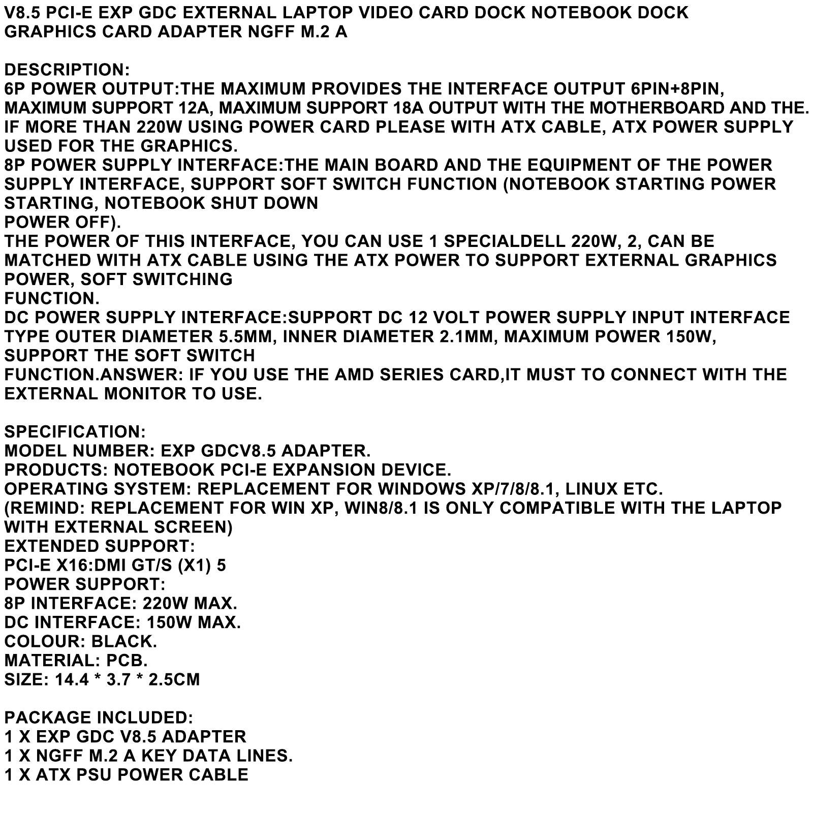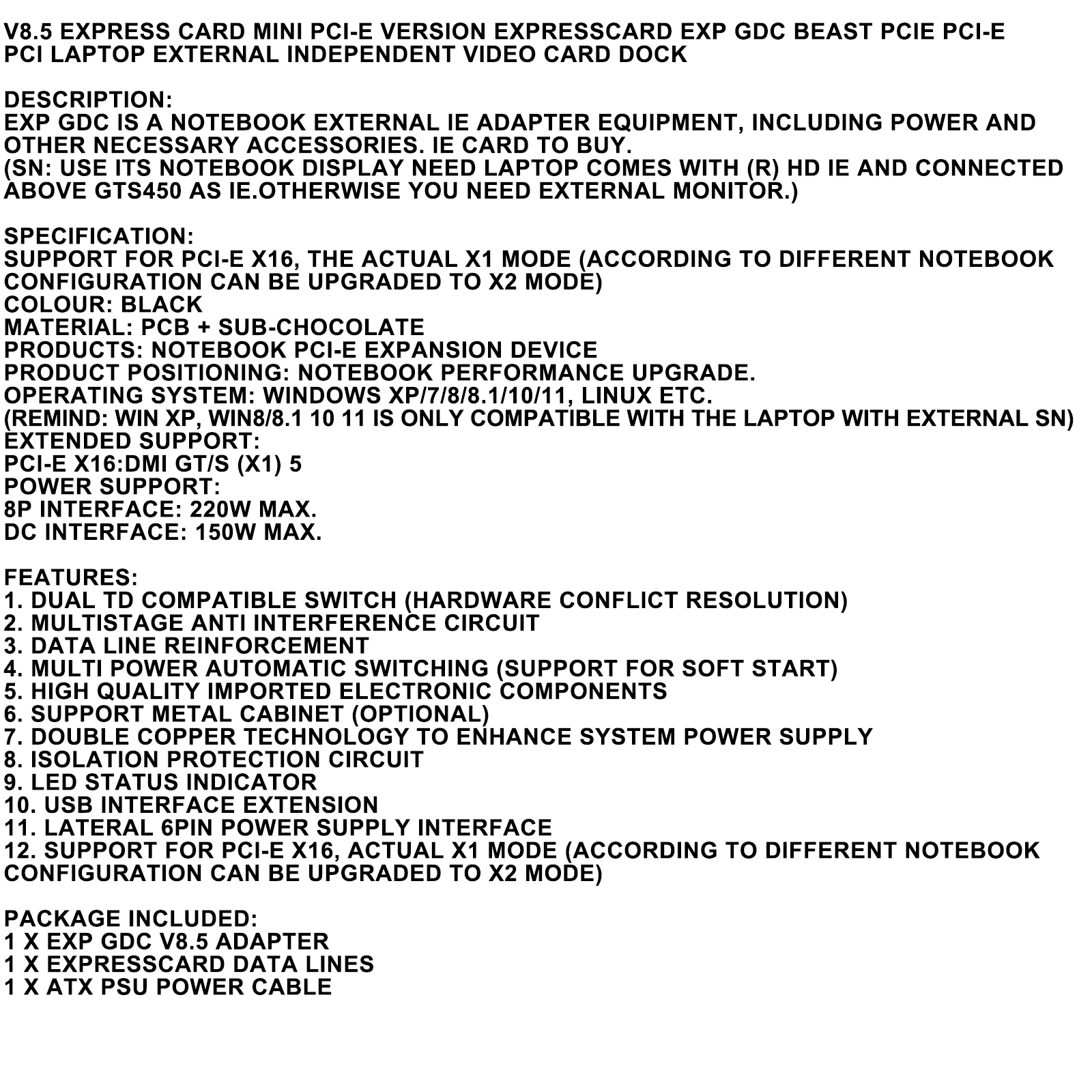 12. Support for PCI-E X16, actual X1 mode (according to different notebook configuration can be