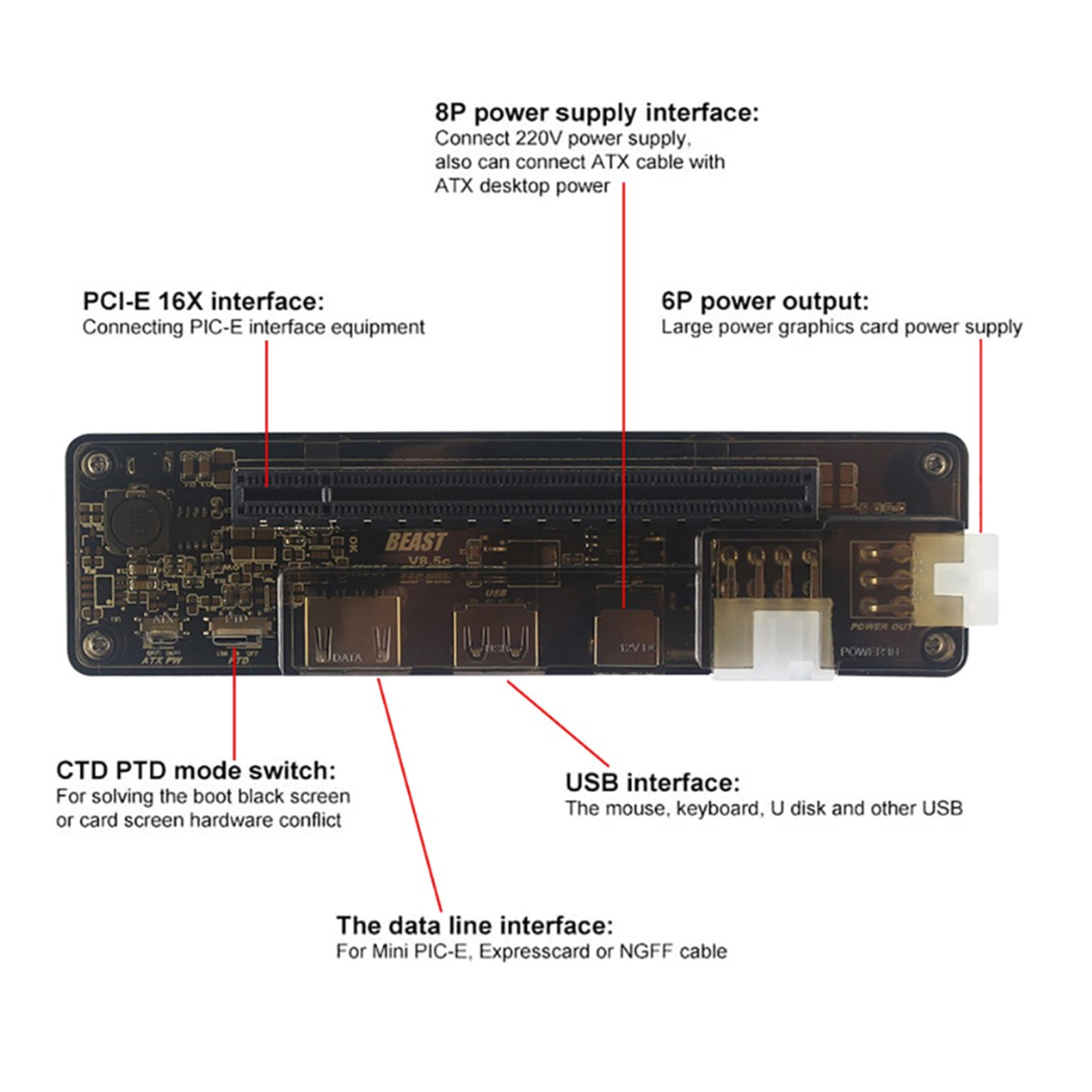 2. Data line Interface: For Mini PCI-E, Expresscard, NGFF(M.2)A/E Key or M Key, PCI-E X4 Converter Cable; Supports RTX.T(make sure you have correct connections)