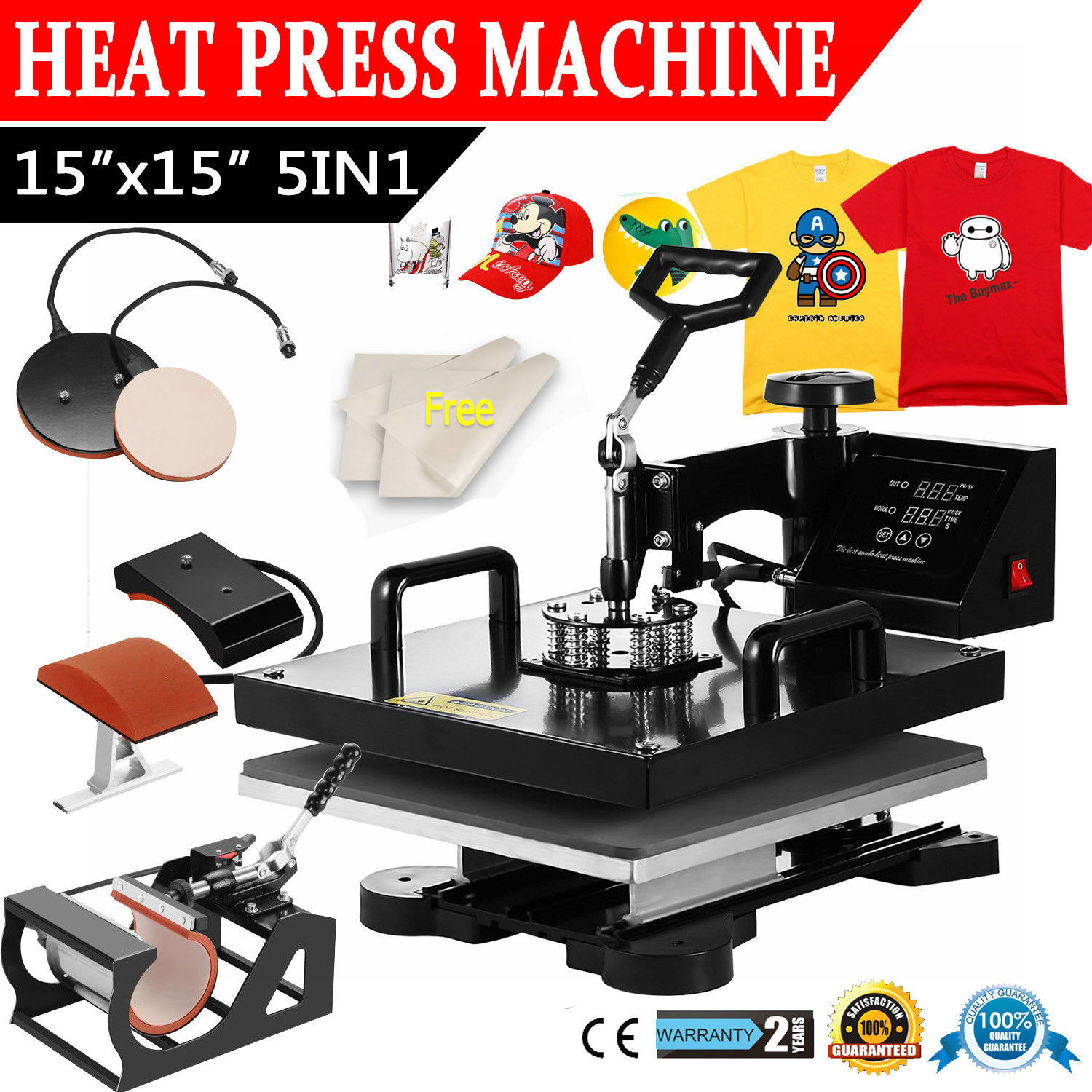 This 5 in 1 heat press machine can be used for T-shirts, caps, ceramic plates, ceramic tiles, mugs, coasters, mouse pads, jigsaw puzzles, lettering, other misc, fabrics & materials. It can transfer colorful pictures and characters of sublimating and dissolved printing ink onto ceramics, glasses and textiles such as cotton, flax, chemical fiber, nylon, etc. This all-in-one press includes flat platen, mugs and plates. The swing-away heat press boasts all of the must-have attachments. It has a built-in Teflon coated 15" x 15" (38 x 38cm) heat platen with a full range of heating coils to allow for consistency throughout its surface. The digital timer control is adjustable up to 999 seconds. The features a digital temperature gauge ranging from 0 - 250℃ (about 480℉).