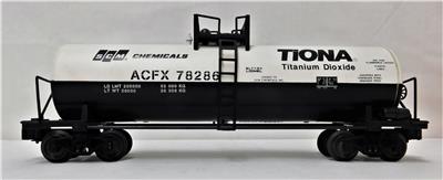 Lone Star Trains and Collectibles, YOUR Classic Era Train Headquarters! You are looking at a Lionel 6-17906 Standard O Uni-body Tank Car. Leased to haul SCM chemicals, this one comes with Titanium Oxide. With its white top and sharp black lettering, it will make a great addition to any layout or Lionel collection.