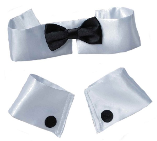 NEW in package. Includes shiny sateen white collar with black bow tie,