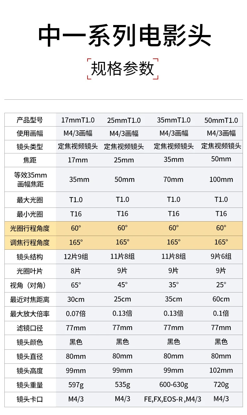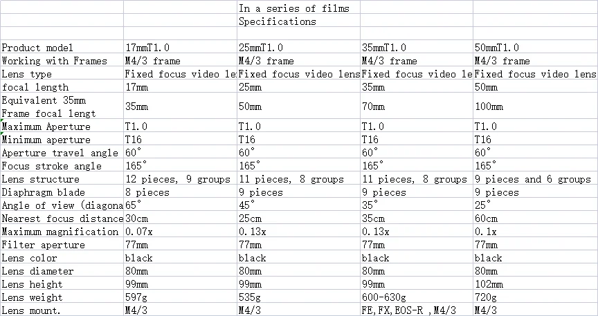 Product model | 17mmT1.0 | 25mmT1.0 | 35mmT1.0 | 50mmT1.0 |