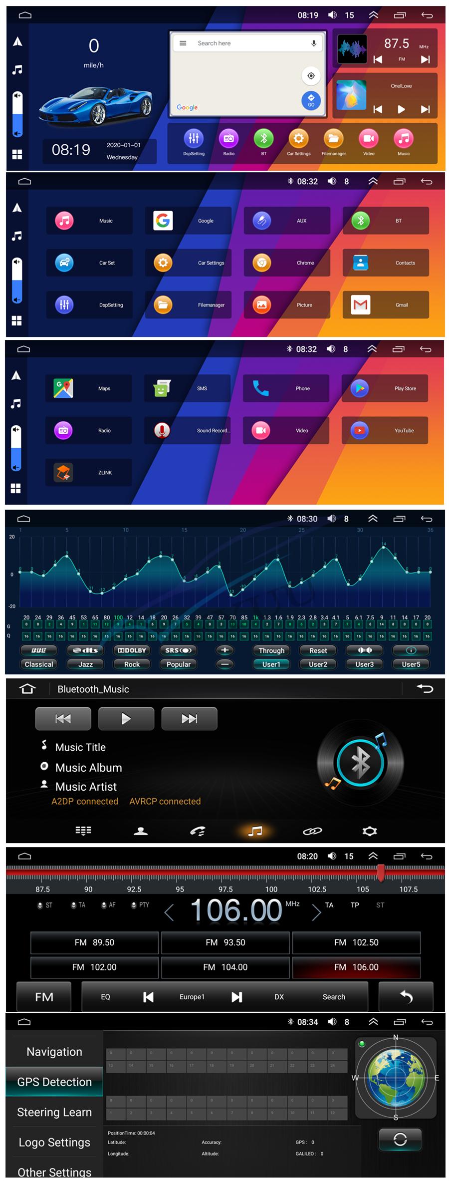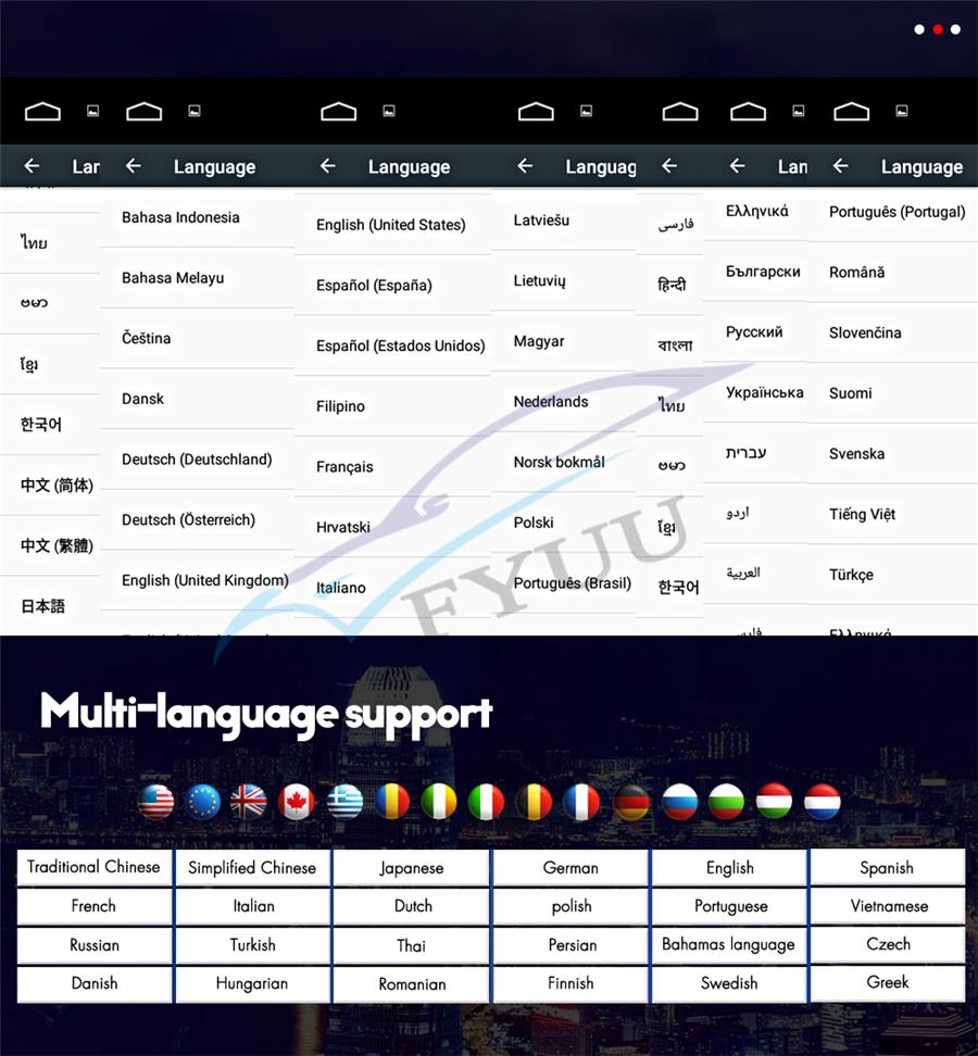 Setup | - WiFi/Hotspot/Bluetooth: Yes - Brightness level adjustable: Yes - Wallpaper: Wallpapers/Live Wallpapers/Gallery - Sound: Key Tone & Volume - Storage: Display Internal Storage/Nand Flash/Connected Device Storage - Apps: Running Apps display/force stop/uninstall - Security: Yes - Accounts: Yes - Languages and Input: more than 70 Languages and choose input method - Backup and Reset: Yes - Date and Time: Setting Date&Time by yourself or choose GPS/network-provided time - Accessibility: Yes - GPS: Yes, GPS application options/monitoring/sound mode/mixing ratio - Driving safety: Watching Video, Reversing X-mirror/Volume, Reversing Trajectory/radar Display, Rear view ruler - Amplifier: Rock/Pop/Jazz/Classic/Flat/Voice/Custom - Steering Wheel Control: Yes - About Device: Display Parameter Info. |
