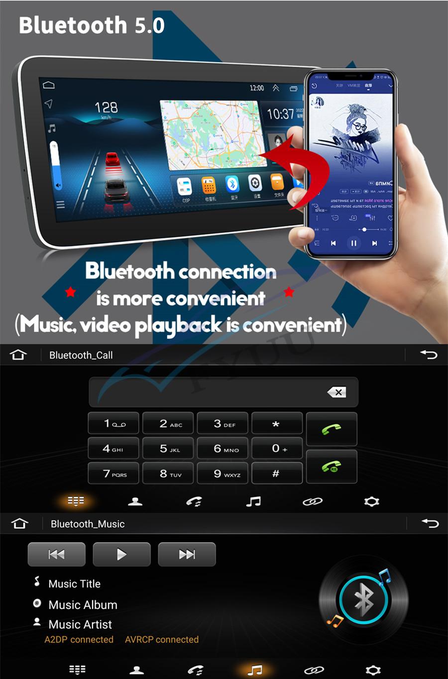 Bluetooth | -Bluetooth 5.0 - Hands Free: Yes - A2DP (Bluetooth Stereo Music): Yes, can play stereo music through Bluetooth- Bluetooth Music Control: Yes, play/pause/previous/next - PB-Download: Yes, can download phonebook from mobile to this unit - PB-Search: Yes, can use the first letter to search contact member in PB-Listings - Calling Records: Yes, Dialed Call, Received Call, Missed Call - Setup: Auto Answer, Auto connect, Device name - Built-in Microphone: Yes, on the front panel - External Microphone Jack:Yes on the RCA cable |